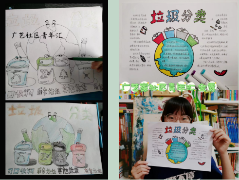 在广艺家·社区青年汇,社工崔丹丹正在为参与活动的青少年介绍垃圾分类志愿宣讲会流程,她为大家展示了小朋友们手绘的垃圾分类标识,鼓励青少年朋友们进行经验分享,并在生活中带动身边人积极参与垃圾分类,让“小小”志愿者,发挥“大大”的力量。